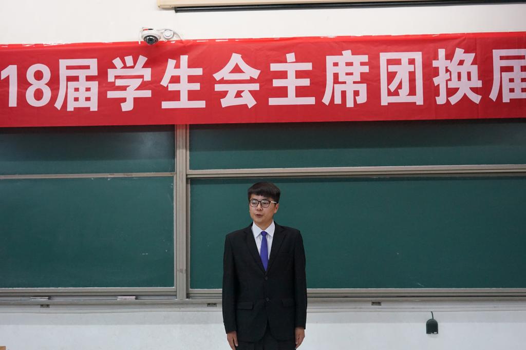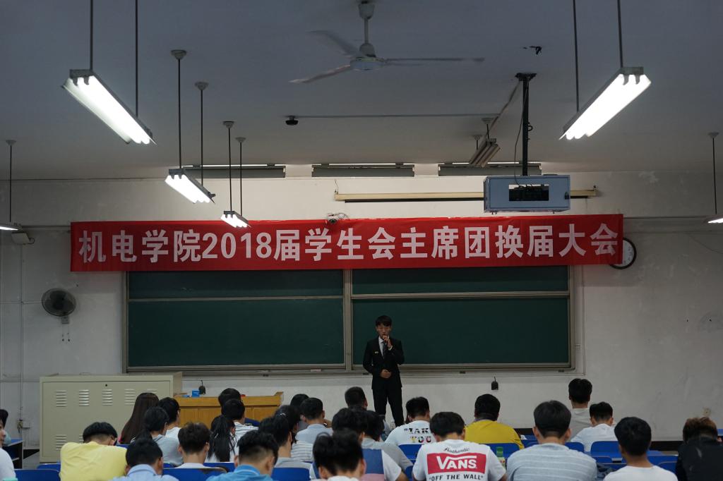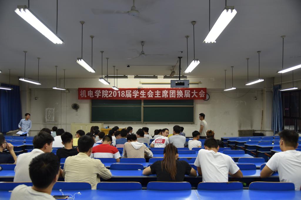 在四合二教室举办2018届学生会主席团换届大会。党委副书记李印、团委书记朱黎娅、团委副书记郭小月、团委副书记申冲、辅导员孟书广、辅导员朱佳音携2017届学生会主席团成员出席会议并担任评委,各年级学生代表300余人参加了会议。学生会91猫先生主任李路主持本次会议。