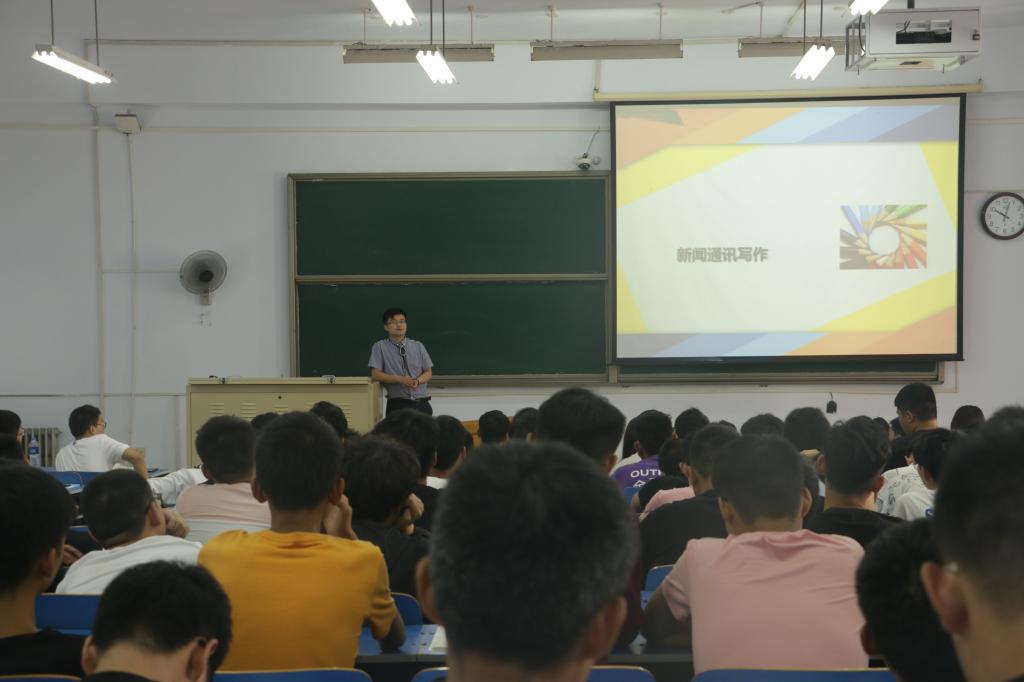 在4#二、4#三教室召开新生辅导员见面暨新闻写作会,会议由辅导员孟书广主讲。