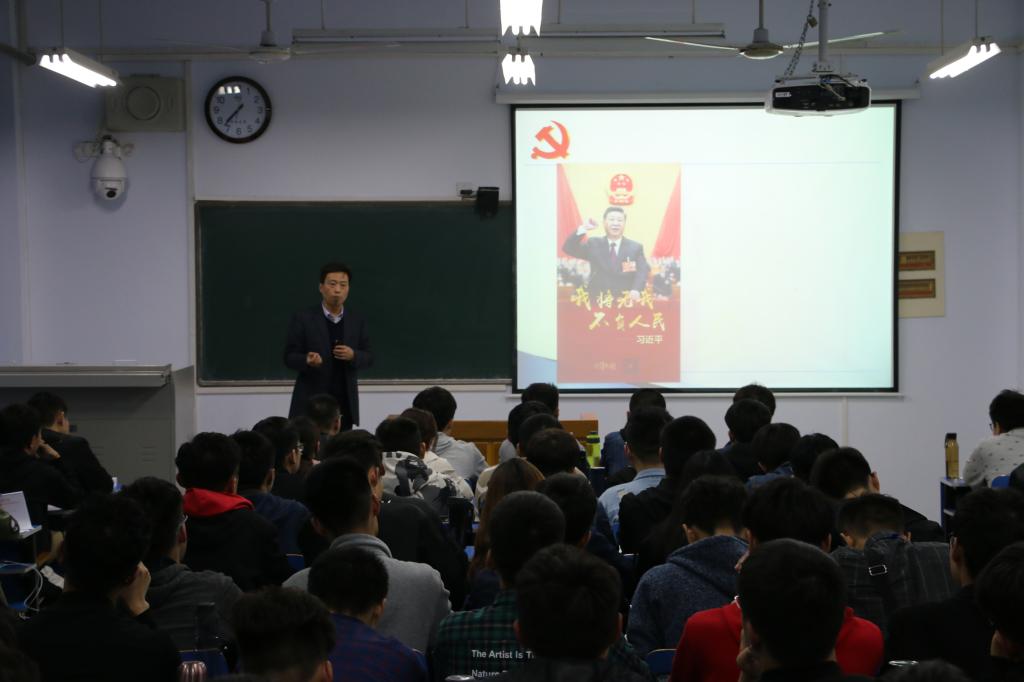 樊跃峰首先对中国共产党人的初心和使命进行了回顾,说明中国共产党人的初心和使命,就是为中国人民谋幸福,为中华民族谋复兴;随后,由向同学们分析如何做到“不忘初心”,告诉同学们,要实现新时代党的历史使命,必须坚持以新思想为指引,把习近平新时代中国特色社会主义思想作为行动指南,深刻把握贯穿其中的马克思主义立场观点方法,更好地用新思想武装头脑、指导实践、推动工作,实现中华民族伟大复兴的中国梦。