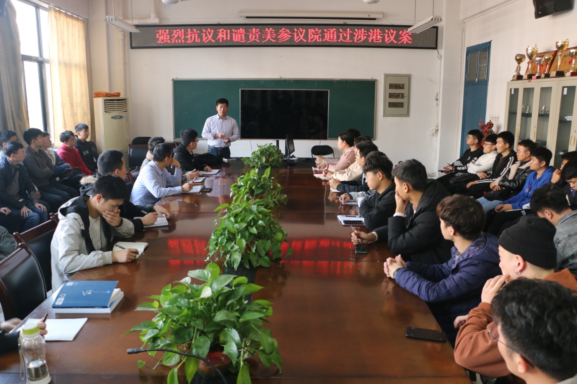 在4304会议室开展“强烈抗议和谴责美参议院通过涉港议案”主题团日活动。团委学生会主要学生干部以及各班团支书70余人参加了此次活动,91猫先生
