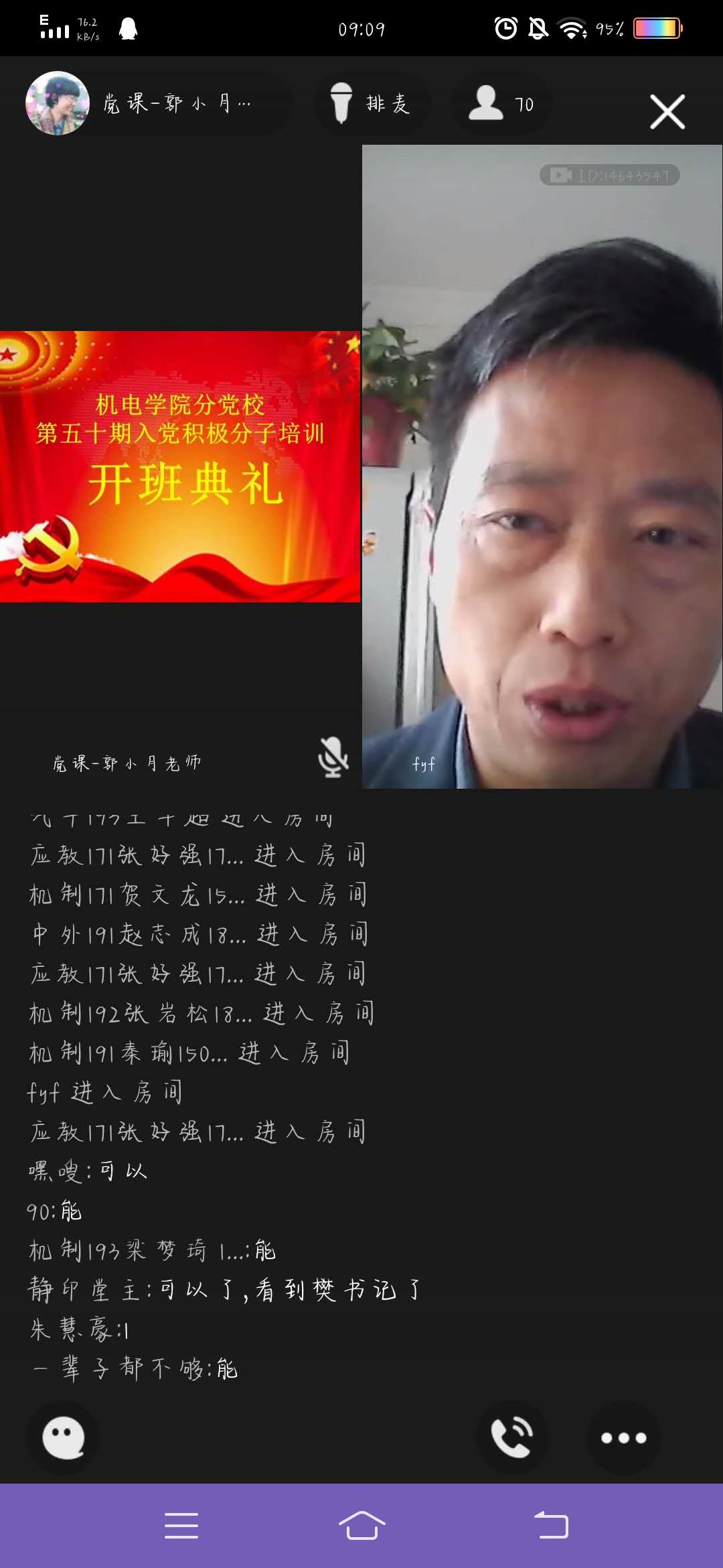 党委第五十期入党积极分子培训开班,培训班开班典礼以在线直播的形式进行。学院分党校校长樊跃峰,分党校副校长李印,团委书记何涛,正科级辅导员郭小月,团委副书记朱佳音以及第五十期入党积极分子培训班全体学员参加了此次开班典礼。开班典礼由郭小月主持。
