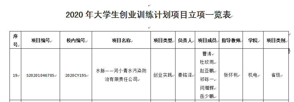 由张怀彬老师指导,学生秦铭泽、闫增辉、祁铄一、杜欣雨、赵亚鹏、曹涛、岳少鹏共计7人组织参与的创业项目——水脉•河小青水污染防治责任有限公司在校级立项的基础上,入选省级立项,并确定为省级创业实践项目。