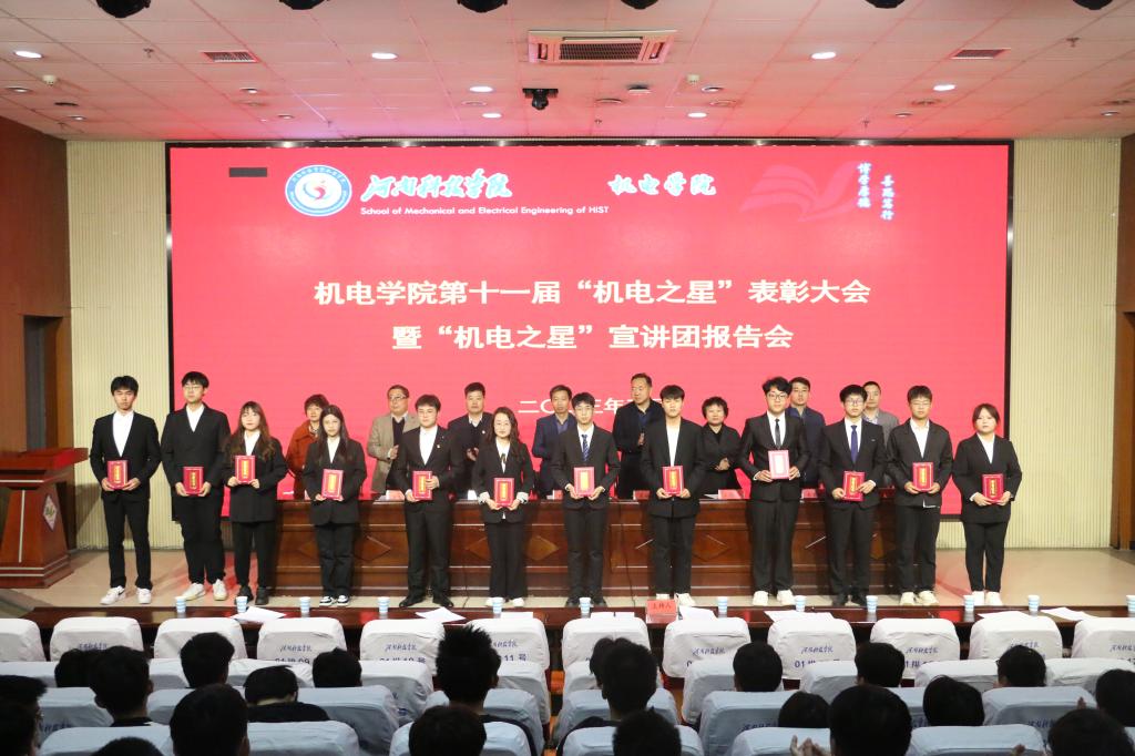 第十一届“机电之星”的决定》。紧接着,与会领导老师们为获得第十一届“机电之星”的同学颁发证书并合影留念。