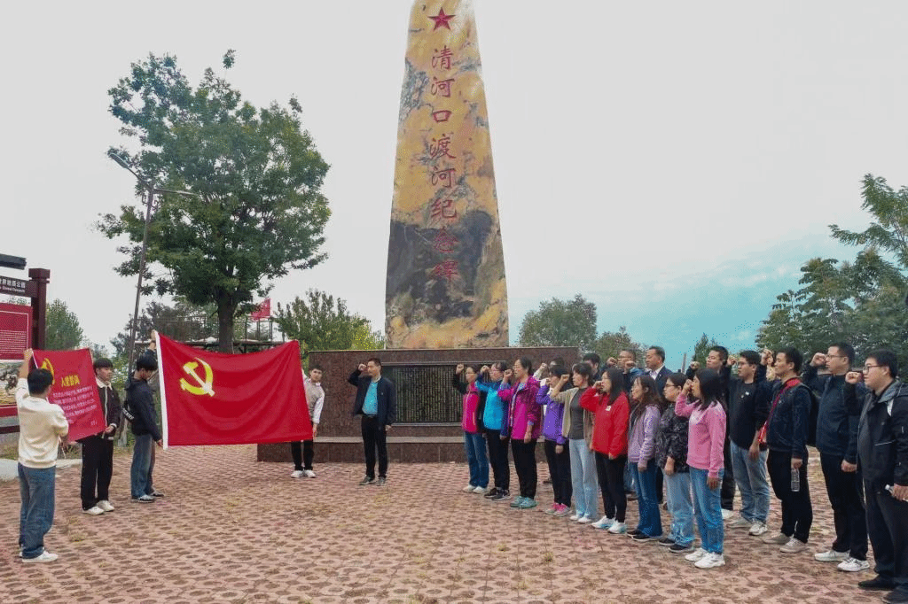 全体党员在清河口渡河纪念碑下进行宣誓,党员们面对党旗,声声誓言,铿锵有力,充分展现了全体党员对党的无限忠诚以及对工作不懈奋斗的坚定决心。