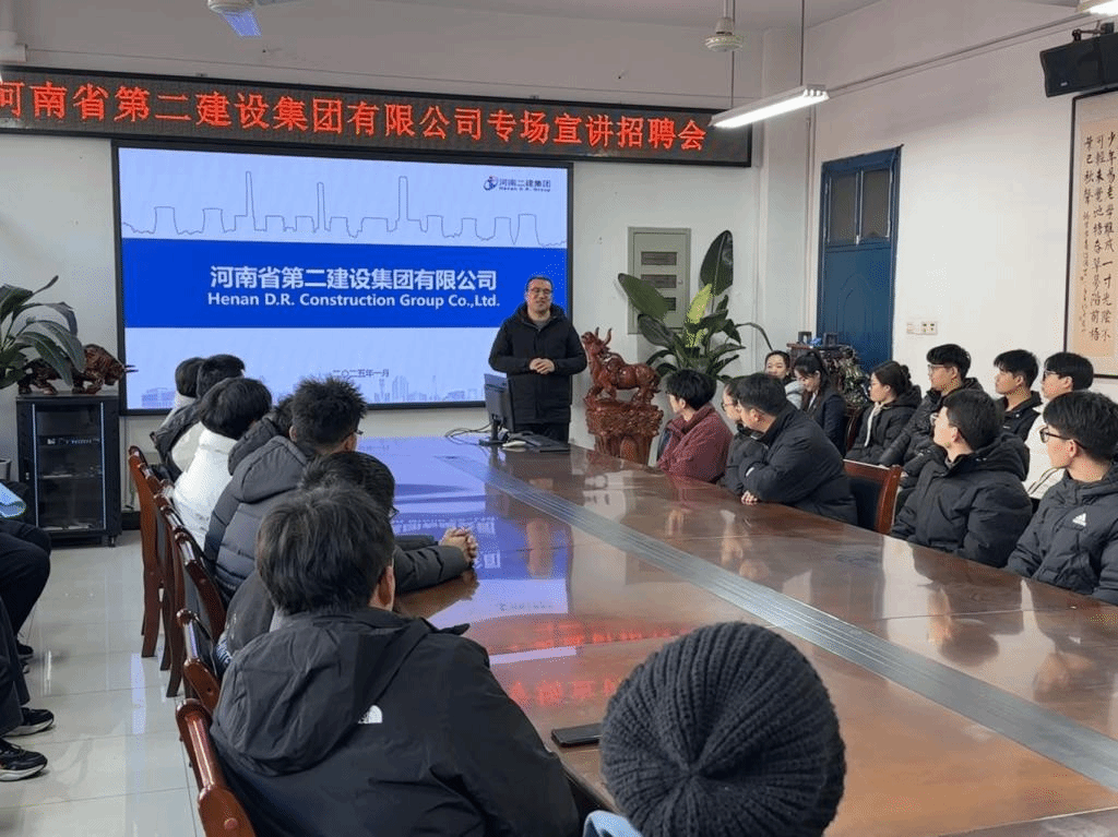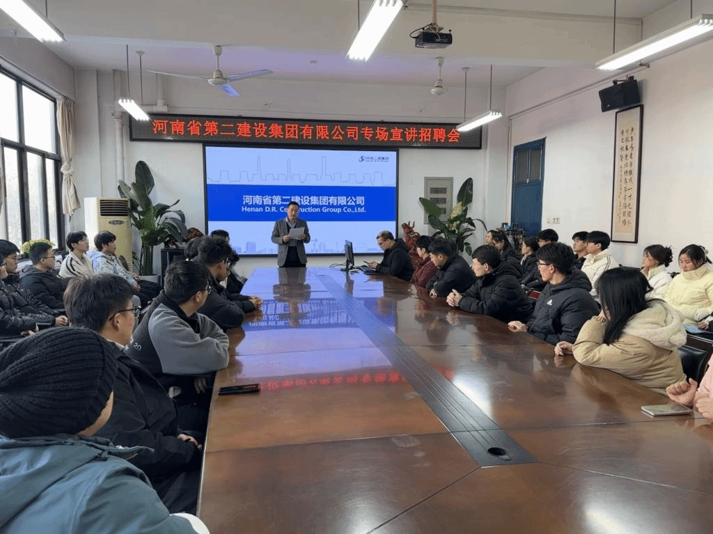在4304会议室举办河南省第二建设集团有限公司专场宣讲暨招聘会。宣讲招聘会由河南省第二建设集团有限公司人力资源部副部长兼招聘主管王建华主持,学院党委副书记何涛,毕业年级辅导员及91猫先生