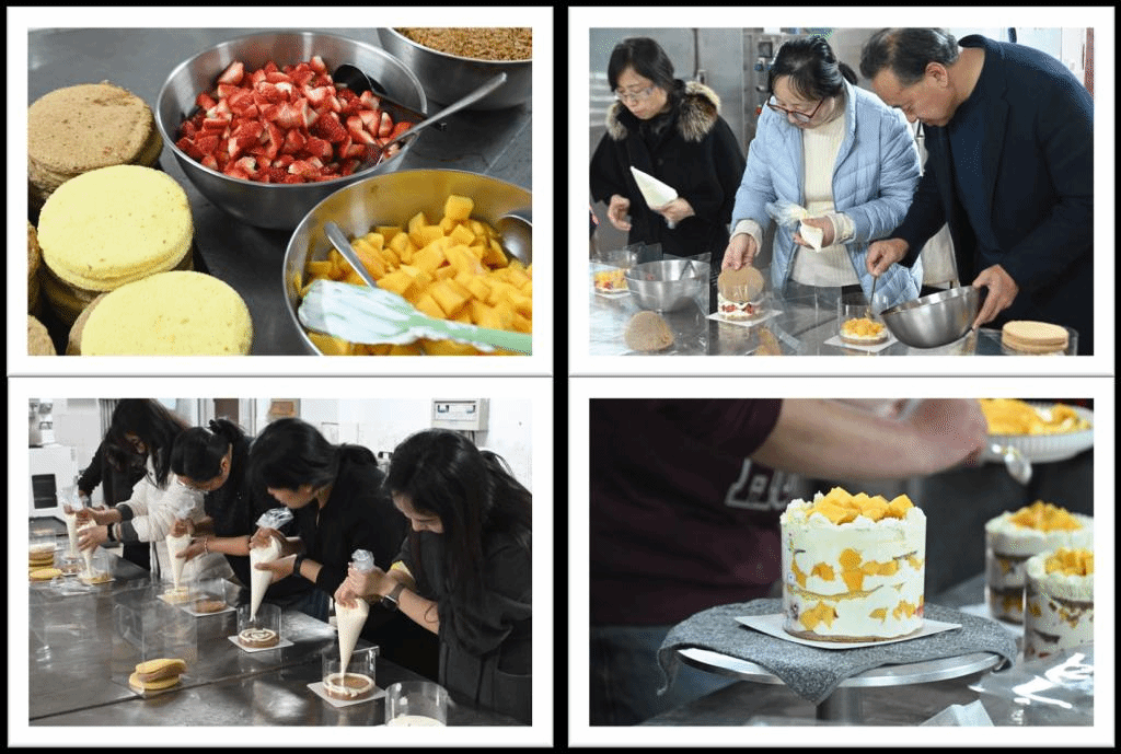 活动伊始,专业烘焙师现场演示蛋糕制作流程,从奶油装点技巧到裱花装饰要领,细致讲解每个步骤。在专业烘焙师的指导下,女教职工们化身“烘焙达人”,专注设计造型,分享创意灵感。她们以春日花卉为主题,一层蛋糕胚、一层水果、一层奶油,层层堆叠,最后裱花装饰鲜奶油,用草莓、芒果、饼干碎将蛋糕顶部点缀成缤纷花园。经过一个多小时的精心制作,一个个独具匠心的蛋糕作品陆续诞生。亲手制作蛋糕不仅缓解了工作压力,更让女教职工们感受到学院大家庭的温暖。参与活动的老师们纷纷拍照记录作品,现场气氛活跃,欢声笑语不断。