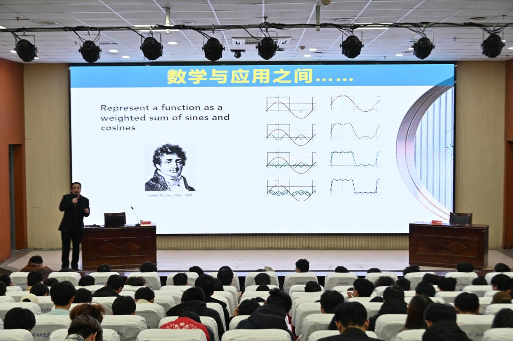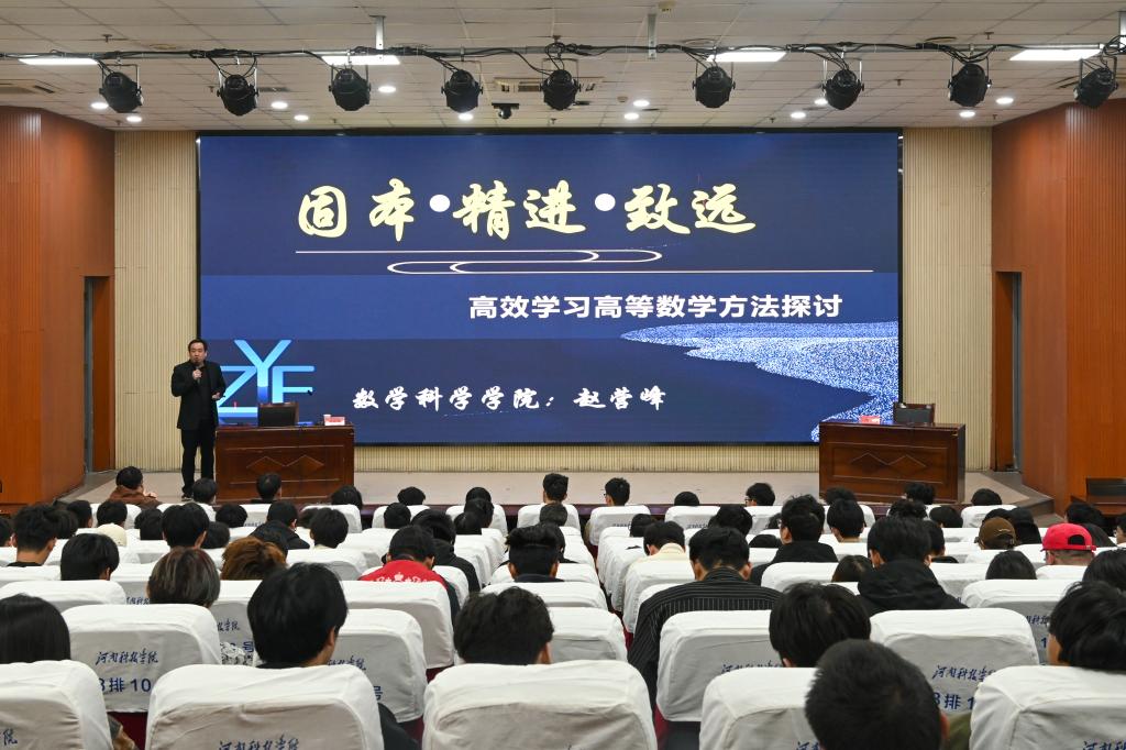 本次报告会特邀我校数学科学学院博士赵营峰副教授作报告,赵营峰以《固本·精进·致远》为题,以“高效学习高等数学为方法”为切点,围绕“学习高等数学的重要性”“高等数学的特点”“如何提升高等数学的学习效率”等,多方面分析了高等学习在日常生活中运用,多角度阐述了高等数学在工科类专业课程中学习的重要作用。通过详实的数据、生动的实例,借助“余数”“拉格朗日定理”“范德蒙行列式”等数学概念,结合多年的教学经验和个人学习经历,分析了大学数学学习与高中数学学习模式的本质差异,讲解了考研备考时数学的学习方法,解析了数学在探索大自然奥秘和日常生活中的实际应用。并给与会学生提出高等数学学习的三点建议:一是大框架、微细节。高效学习策略要先构建知识的大框架,再逐步填充细节,形成完整的知识体系;二是常反复、勤关联。学习过程当中需要不断复盘,以巩固记忆和理解,提高学习效率;三是聚小组、勤勉励。建立朋辈互助学习小组相互监督,相互激励,共同进步。