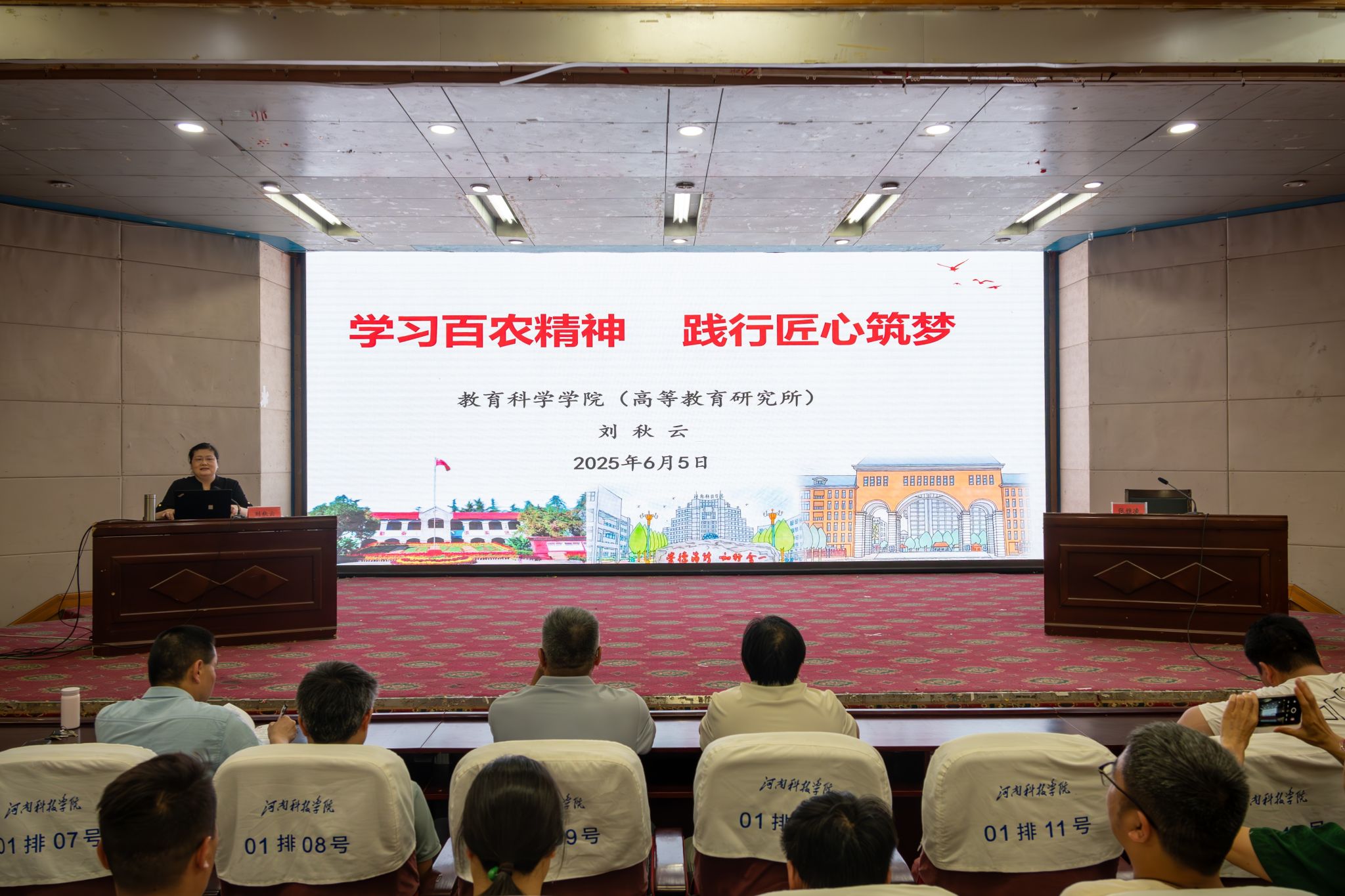 本次报告会特邀请教育科学学院副院长刘秋云以《学习百农精神 践行匠心筑梦》为题作专题报告。刘秋云以真挚的情感和深入浅出的语言,为学院师生系统阐释了“百农精神”的历史根基、凝练过程、核心内涵与时代价值,并深入剖析了学院发展过程中践行“百农精神”的现实路径。