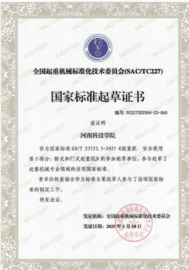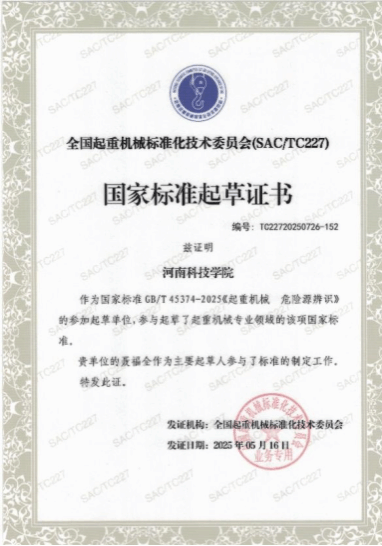 聂福全教授作为主要起草人参与制定的《起重机械危险源辨识》、《起重机械安全使用》两项国家标准,获得全国起重机械标准化技术委员会批准发布,填补了我校在起重机械国家标准制定领域的空白。