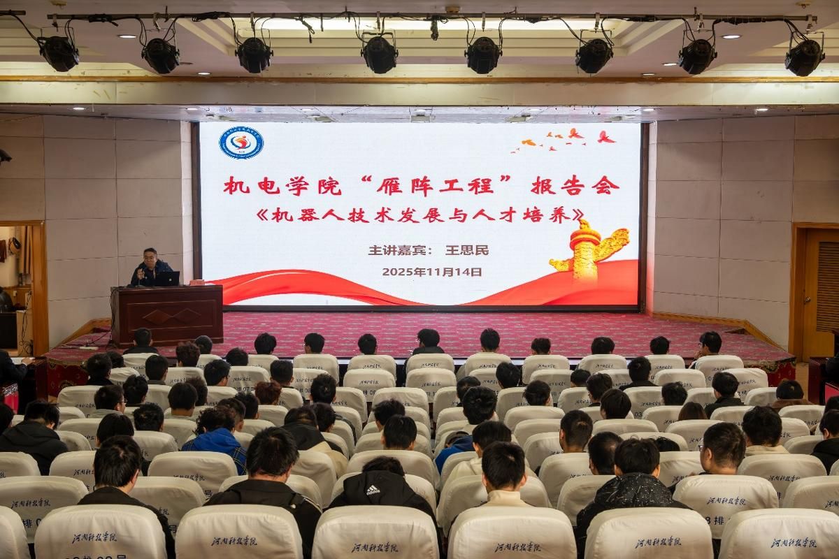 在图书馆一楼报告厅成功举办《机器人技术发展与人才培养》专题报告会。报告会由河南威猛振动设备股份有限公司总经理王思明担任主讲,学院180余名学生到场聆听。学院党委副书记何涛主持本次报告会。