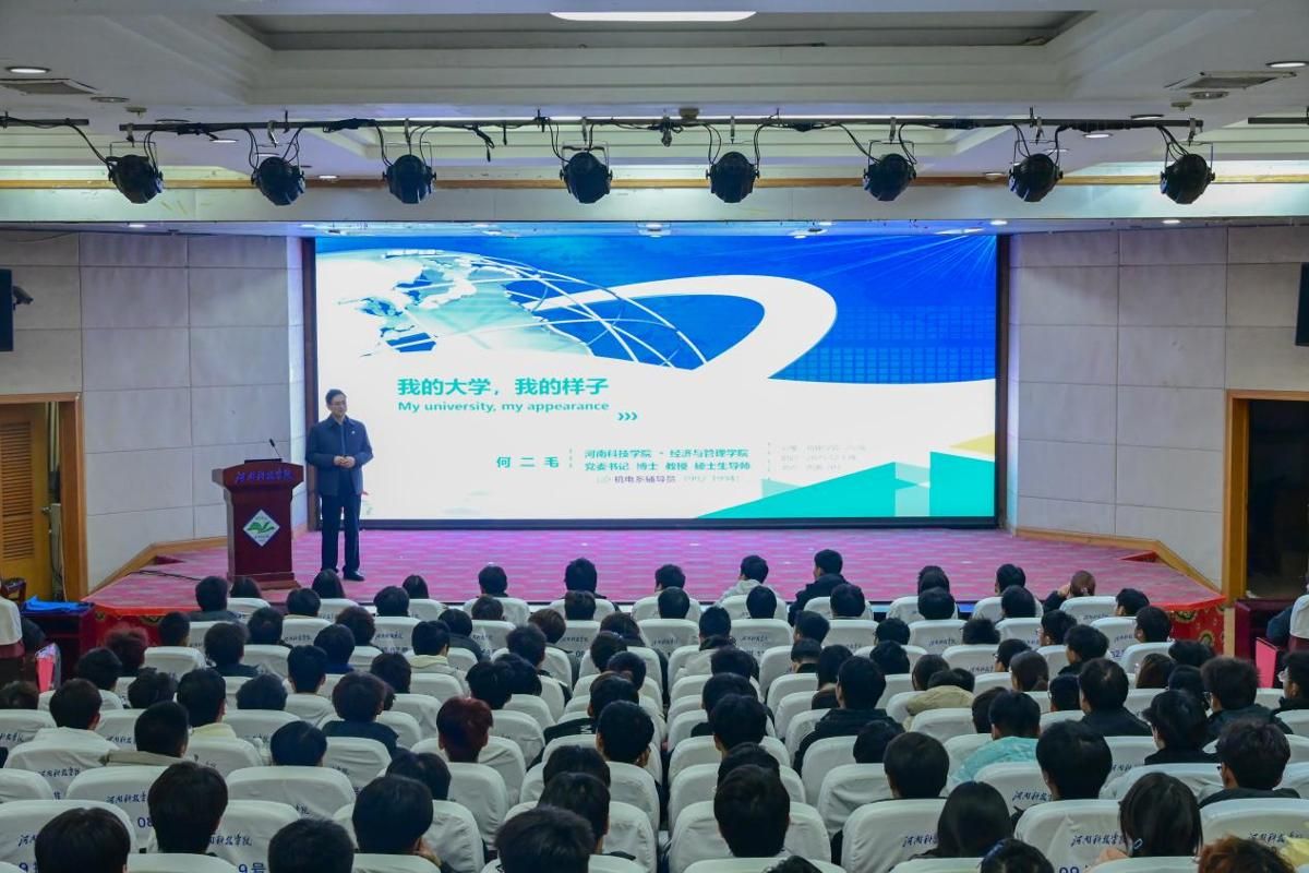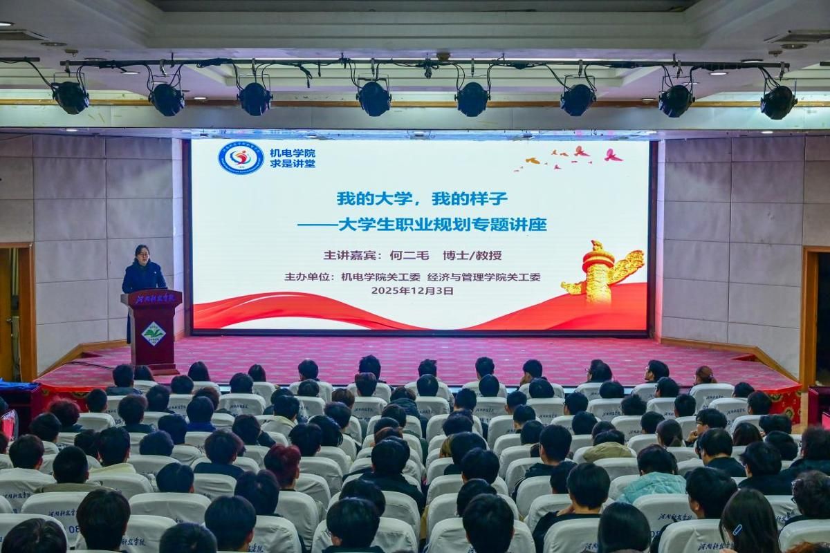 何二毛教授以《我的大学,我的样子》为题,为新生们带来了一场兼具思想高度与实践深度的指导。他首先结合党的二十届四中全会精神,剖析了国家未来五年乃至更长时期的发展战略,结合生动案例与深刻见解,系统阐述了职业规划的逻辑框架。他强调,大一阶段非常关键,制定学业规划如同系好第一粒扣子,对未来升学和就业具有重要基础作用。并针对机电专业学生的职业发展方向提出三点建议:一要筑牢专业根基,在掌握核心技能的同时培养跨领域综合素养与解决复杂工程问题的能力;二要强化实践锻炼,通过实习实训、研读行业报告等方式明确岗位需求,提升能力培养的针对性;三要做好动态调整,职业规划需根据国家产业升级与技术变革的趋势动态调整,做到既仰望星空,又脚踏实地。