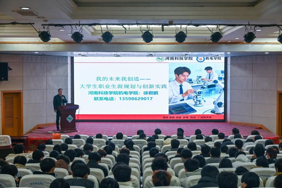 报告会特邀学院实验中心主任徐君鹏担任主讲。他以“我的未来我创造——大学生职业生涯规划与创新实践”为主题,紧密结合机电行业发展趋势与企业人才需求,从专业价值认知、职业目标定位、实践路径规划三个层面展开阐述。徐君鹏通过丰富的教学与就业指导经验,生动剖析了多位机电领域优秀校友的求职与创业实例,使内容兼具启发性与参照性。此外,他针对大一新生在职业规划中常见的困惑与误区,分享了求职准备、竞争力提升、创新实践积累等方面的具体方法与策略,为同学们提供了切实可行的行动指南。
