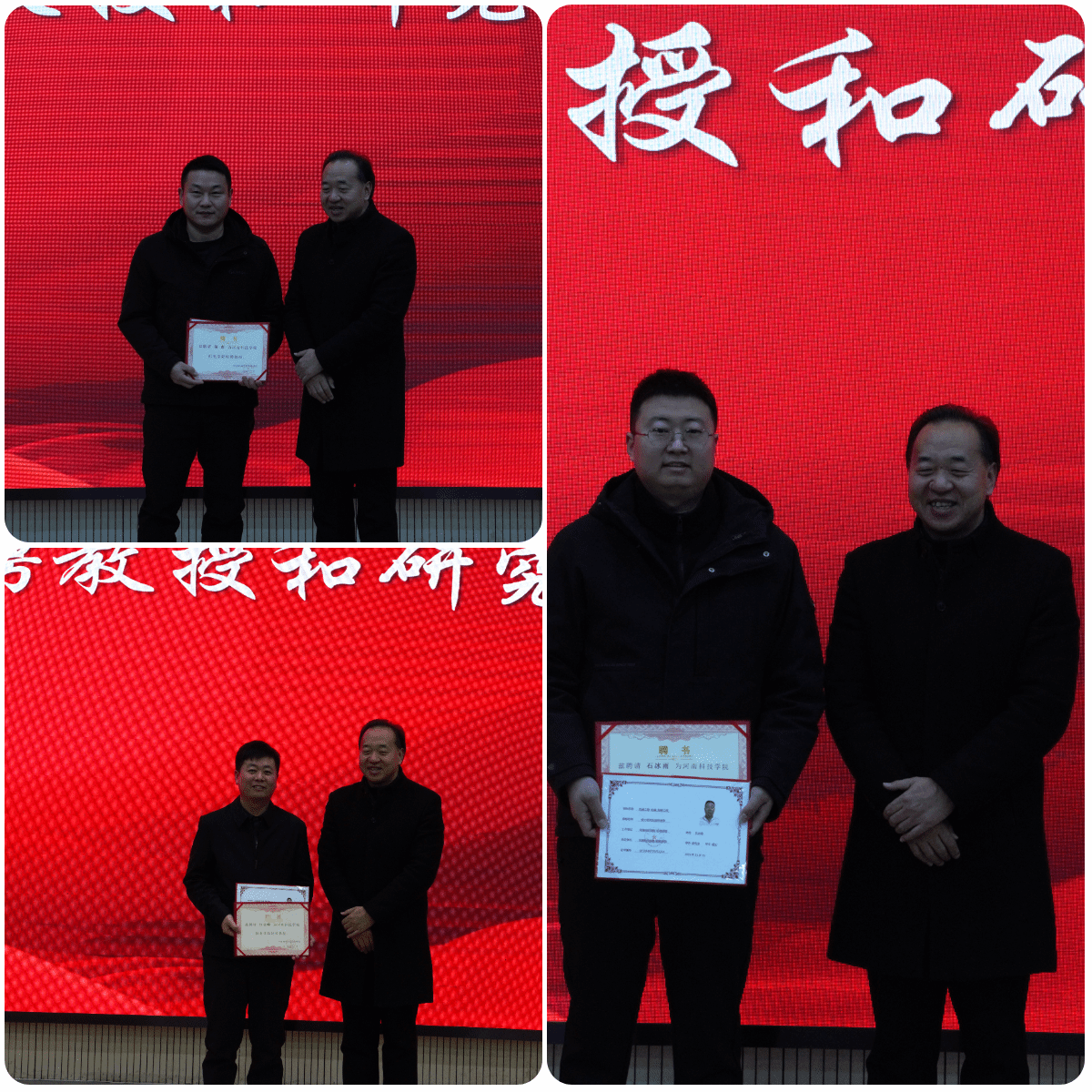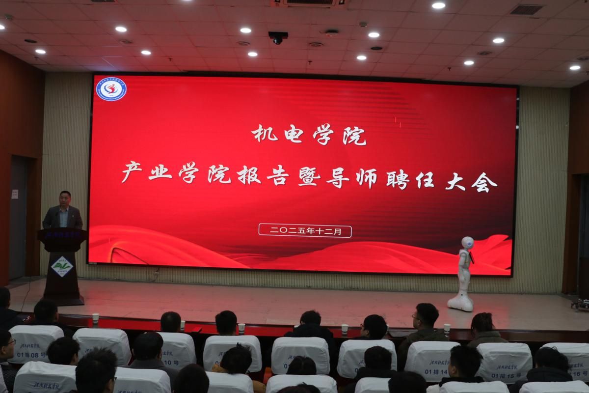 在图书馆一楼报告厅举行产业学院报告暨导师聘任大会,立讯机器人智能装备中心总监顾福乾、立讯精密校企合作部经理汪宝峰、河南勤工智能装备有限公司技术总监刘洋、河南河一工精密工具有限公司常务副总张桂山等出席会议,91猫先生