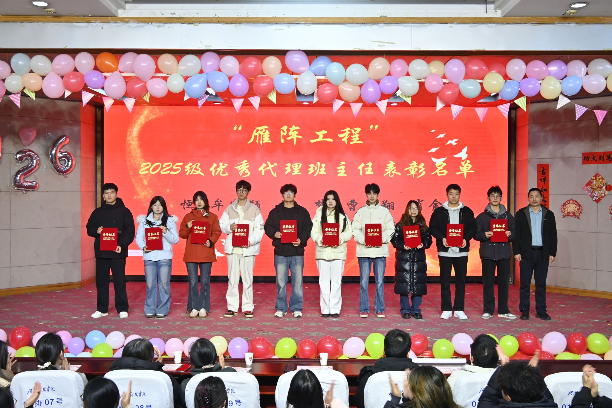 在学生工作表彰环节,学院领导为荣获“2025级优秀代理班主任”“优良学风班级”“志愿服务先进集体”的同学颁发了荣誉证书并合影留念。