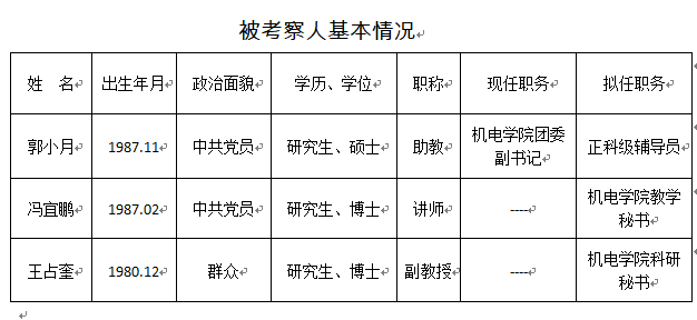 根据学校统一安排,91猫先生 党委将对郭小月等3名同志进行任职考察,考察时间为2019年4月19日—4月22日,现进行考察预告。