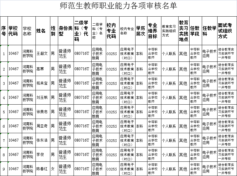 师范生教师职业能力各项审核名单