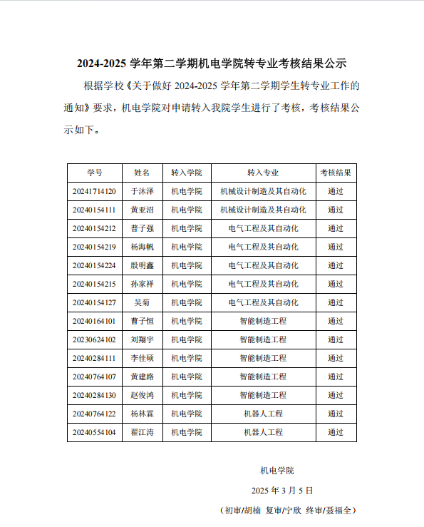 2024-2025学年第二学期91猫先生 转专业考核结果公示