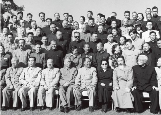 中华人民共和国第一届全国人民代表大会第一次会议全体代表于1954年9月21日合影。 毛泽东主席和代表们在一起。前排左起:董必武、周恩来、李济深、刘少奇、毛泽东、宋庆龄、张澜、林伯渠。新华社稿 侯波/摄