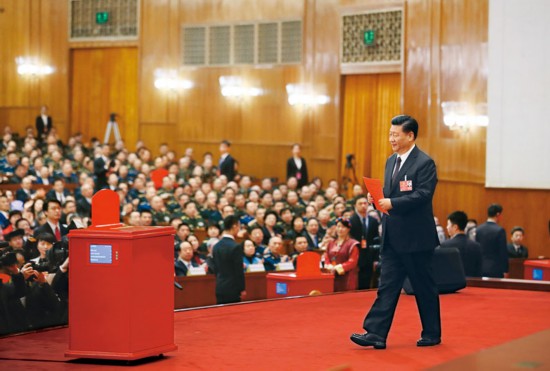 2018年3月17日,十三届全国人大一次会议在北京人民大会堂举行第五次全体会议。习近平当选中华人民共和国主席、中华人民共和国中央军事委员会主席。这是习近平准备投票。新华社记者 兰红光/摄