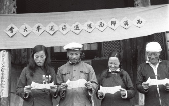 山西省平顺县西沟乡西沟区在1953年9月27日举行选举大会。全国著名农业劳动模范李顺达、申纪兰被选为西沟乡人民代表大会的代表。图为在西沟区选举大会上被选为代表的(自左起)申纪兰、李顺达、韩春兰和张秋全在观看当选证书的情形。新华社记者 项化庚/摄