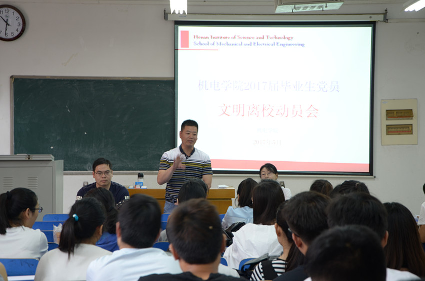 毕业生党员文明离校工作方案》,对相关工作进行了详细的安排。李书记强调:毕业生离校工作是一项既重要又繁琐细致的工作。作为毕业生党员,同学们决不能辜负学校对我们的期望,要用自己的实际行动回报学校四年来对我们的关怀与教育。在思想、行动上做到严格要求自己,处处以身作则,率先垂范,乐于奉献。希望所有毕业生党员都能积极行动起来,从微小的事情和行动出发,一起站好最后一班岗,积极协助各班班干部和辅导员做好各项文明离校工作。