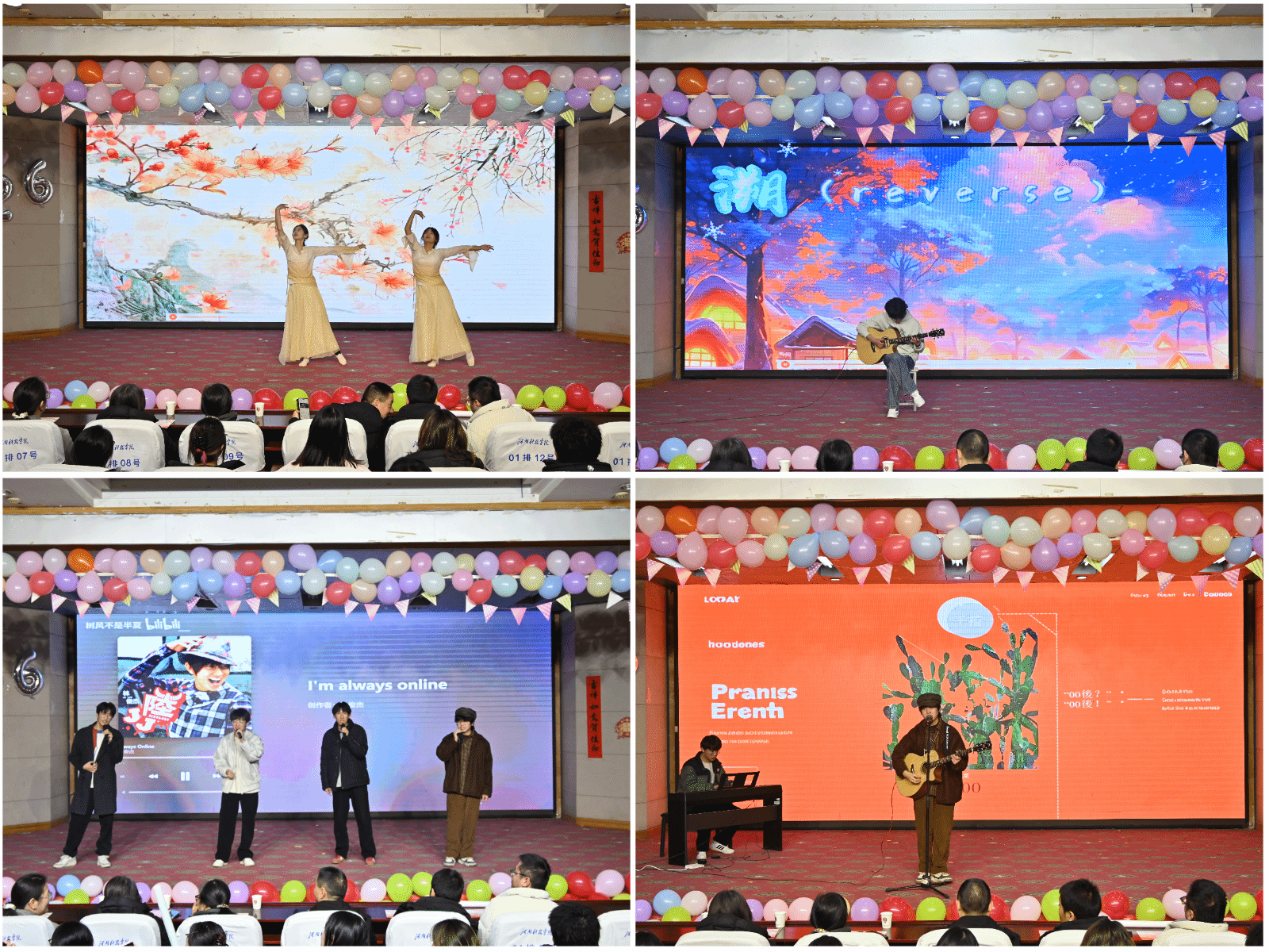 晚会在啦啦队活力四射的舞蹈中拉开序幕。队员们精神饱满、舞姿飒爽,以动感的节奏和整齐的编排点燃全场氛围。随后,十个精心筹备的节目依次登场,涵盖舞蹈、器乐、歌曲、小品等多种形式,内容兼具思想深度与艺术观赏性,充分展现了机电学子全面的艺术素养与昂扬的青春风貌。钢琴独奏《命运》铿锵有力,奏响了奋发向上的青春强音;歌曲《成都》温柔婉转,唤醒了在场师生的共同回忆;小品《奈何桥北》巧妙融合校园生活与励志主题,于欢笑中传递积极能量;器乐合奏《千禧》旋律悠扬,展现了扎实的艺术功底;舞蹈《念琵琶》融古典意蕴于现代编排,诠释了传统文化之美;深情演唱的歌曲《我记得》打动人心;吉他独奏《溯》空灵舒缓,营造出沉浸式的听觉体验;合唱的曲目《九张机》古韵悠长,彰显古典音乐魅力;最后一个节目《Always Online》将现场气氛推向高潮。此外,晚会还特别设置了“猜谜底”的趣味互动环节,游戏互动为这个充满艺术与温情的夜晚增添了更多轻松愉悦的色彩。